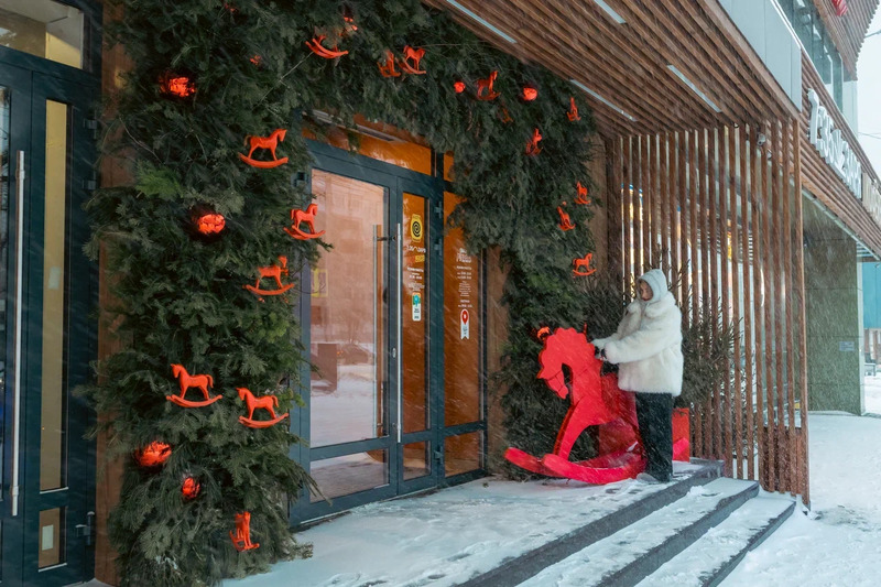 Первая яркая точка — Еловая арка с красными лошадками на проспекте Ленина, 39. Так красочно выглядит парадный вход кофейни и ресторана китайской кухни. Огненная лошадка – символ наступающего 2026 года – действительно здесь хороша и в тему.