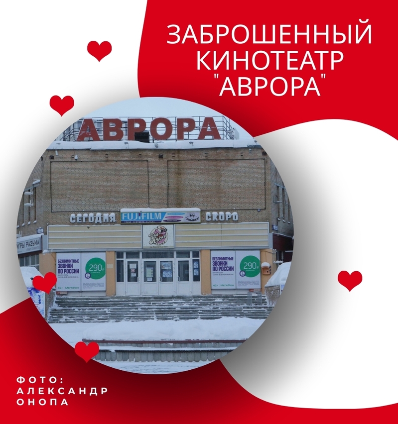 Заброшенный кинотеатр «Аврора». Билеты на «Грозовой перевал» дорогие, а вот легенда с облупившейся штукатуркой уже много лет простаивает просто так. Хороший вид для размышлений о бренности бытия.