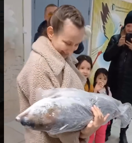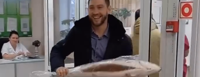 Обычно при выписке из роддома новоиспеченной маме принято дарить цветы. Однако житель Нефтеюганска нарушил эту традицию. Вместо букета он преподнес своей жене Кристине огромную замороженную рыбу - семгу.