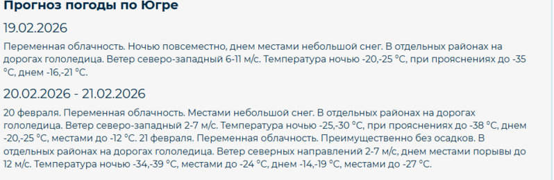 Если верить прогнозу синоптиков, то ближайшие дни в Югре будут аномально морозными. Правда, не во всех городах и районах округа. Так, 19 февраля ночью столбики термометров при прояснениях местами опустятся до минус 35 градусов. Днем синоптики обещают -16,-21 °С.