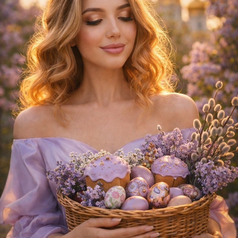 Промпт: используй лицо женщины с загруженного фото. Вертикальный кадр 9:16. Кинематографичный портрет, крупный план девушки по плечи. Лицо строго соответствует референсу — все черты сохранены без изменений. Светлые волнистые волосы распущены, мягко струятся по плечам, подсвечены закатным солнцем. Макияж: свежий, с розовым румянцем, легким хайлайтером на скулах, губы с прозрачным блеском. Девушка стоит в цветущем саду, одета в платье лавандового оттенка из струящегося шелка с открытыми плечами. В руках она держит большую плетеную корзину, наполненную куличами с лавандовой глазурью, яйцами в сиреневых, розовых и золотых тонах с растительным орнаментом, гроздьями сирени и ветками вербы. На заднем плане — размытые кусты цветущей сирени и золотые купола церкви. Освещение: мягкий вечерний свет «золотого часа», контровой свет создает золотистое сияние вокруг волос и плеч.