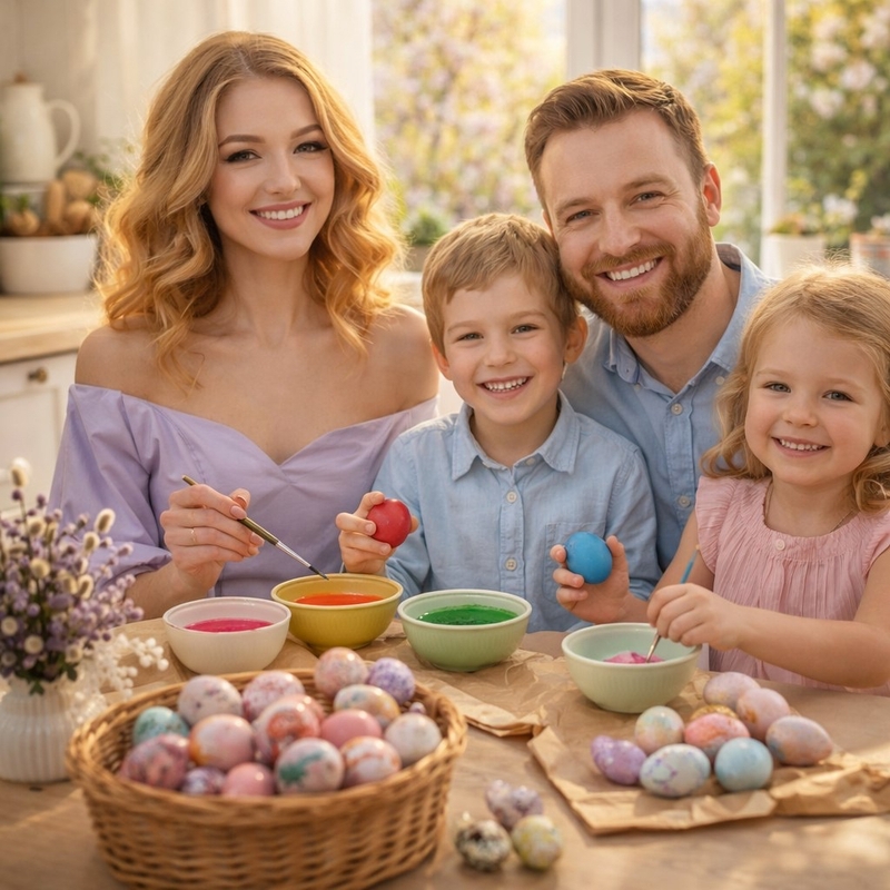 Промпт: Семейное фото: родители и двое детей (мальчик и девочка) за пасхальным столом. Все улыбаются, красят яйца вместе. Светлая кухня, окно с весенним видом, уютная атмосфера. Стиль семейной фотосессии, мягкий рассеянный свет, счастливые естественные эмоции.