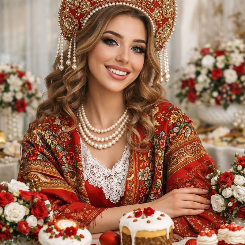Промпт: Создай роскошный пасхальный портрет женщины в русском народном стиле. Красивая молодая женщина с яркой улыбкой сидит за праздничным столом, в красном богато украшенном кокошнике с золотой вышивкой, жемчужными подвесками и традиционным узором. На ней красный платок с орнаментом и жемчужное ожерелье. Вокруг — изысканная пасхальная сервировка: куличи с белой глазурью, украшенные красными цветами, пасхальные яйца, цветочные композиции в красно-белой гамме, праздничные десерты. Атмосфера теплая, нарядная, уютная, студийный свет, светлый интерьер на фоне, высокая детализация, реалистичная фотосъемка, fashion editorial, premium aesthetic, soft light, 4k.
