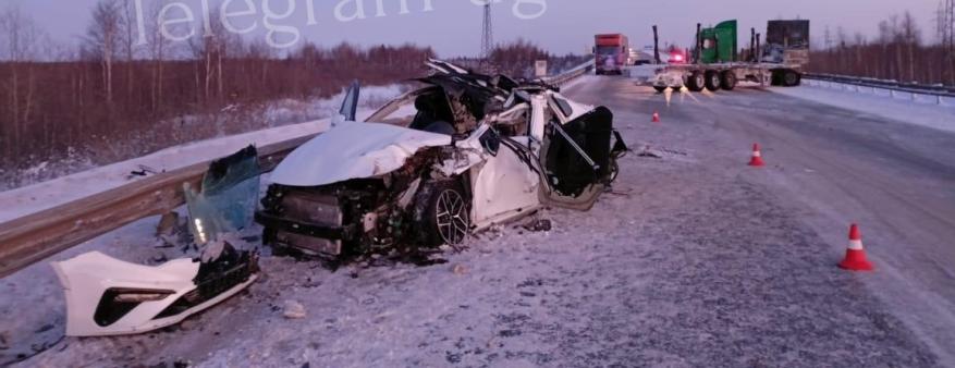 Как сообщает окружная Госавтоинспекция, трагедия произошла в субботу около 14:05 на 731 км дороги «Тюмень-Тобольск-Ханты-Мансийск». 33-летний водитель «МАЗ» врезался в едущий впереди автопоезд «КАМАЗ», а затем его полуприцеп вынесло на встречку, где ехала «Киа».